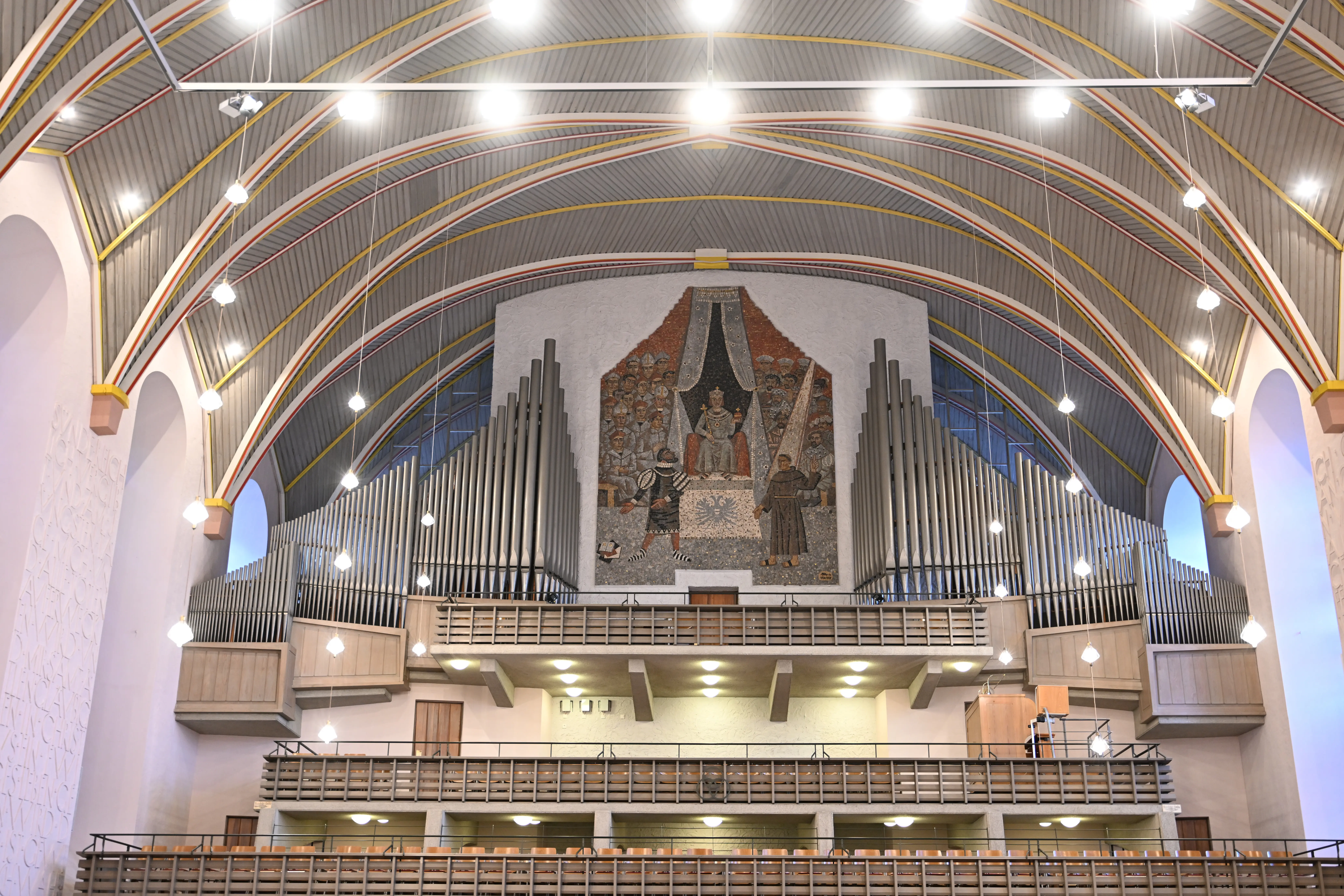 Pedal: Prinzipalbass 16’ - Subbass 16’ - Quintade 16’ - Oktavbass 8’ - Gedecktbass 8’ - Choralbass 4’ - Rohrgedackt 4’ - Bauernflöte 2’ - Quintbass 10 2/3’ - Quinte 5 1/3’ - Rauschwerk IV 3 1/5’ - Mixtur V 2’ - Kontrafagott 32’ - Posaune 16’ - Trompete 8’ - Klarine 4’ - Singend Cornett 2’
